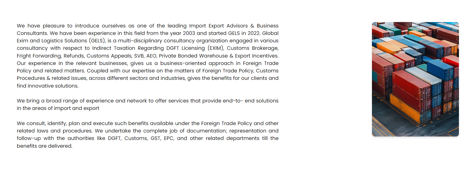 We have pleasure to introduce ourselves as one of the leading Import Export Advisors / Customs Clearing & Forwarding / Business Consultants. We have been in this field from the year 2003. We have extensive experience in all the fields of the Foreign Trade Policy announced by the Government viz Deemed Export, Duty Drawback, Import Authorization for Restricted Items, Export Authorization for Restricted Items, IEC, Duty Free credit entitled under Promotional Schemes, Advance Authorization, Duty Free Import Authorization, Fixation/Modification of Standard Input Output Norms (SION), EPCG Scheme, EOUs, Private Bonded Warehouse Licensing etc.