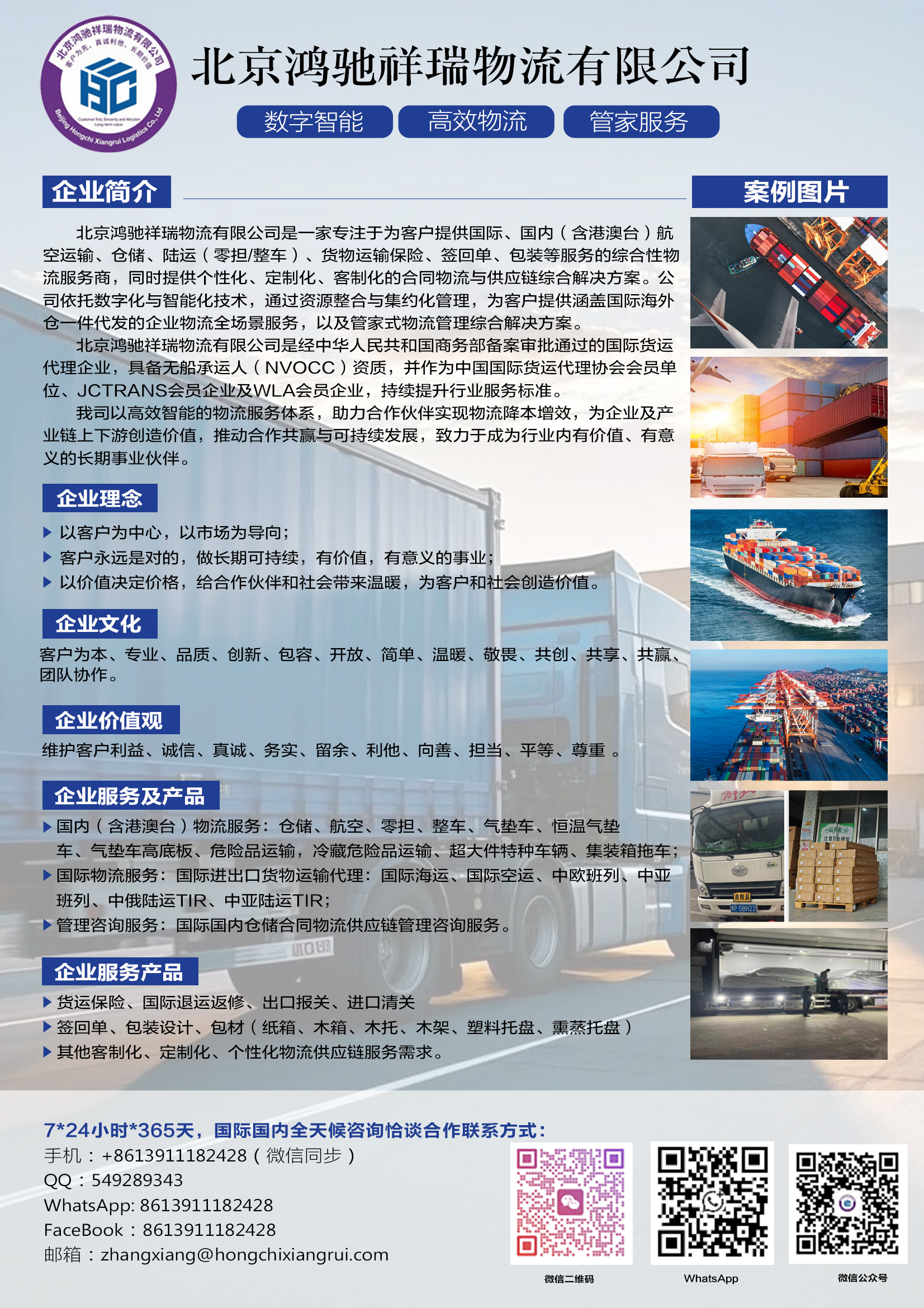 Hongchi Xiangrui is a comprehensive enterprise logistics service provider that focuses on providing international and domestic warehousing, logistics, and one-stop international overseas warehouse delivery services. We offer personalized, customized, and customized contract logistics supply chain solutions. Based on digital intelligence, resource integration is intensive, and a butler style logistics management service solution is provided. Assist enterprises in reducing costs and increasing efficiency in logistics, create value for enterprises, and create value for the upstream, midstream, and downstream of the industry chain, achieving win-win cooperation and long-term sustainable development.