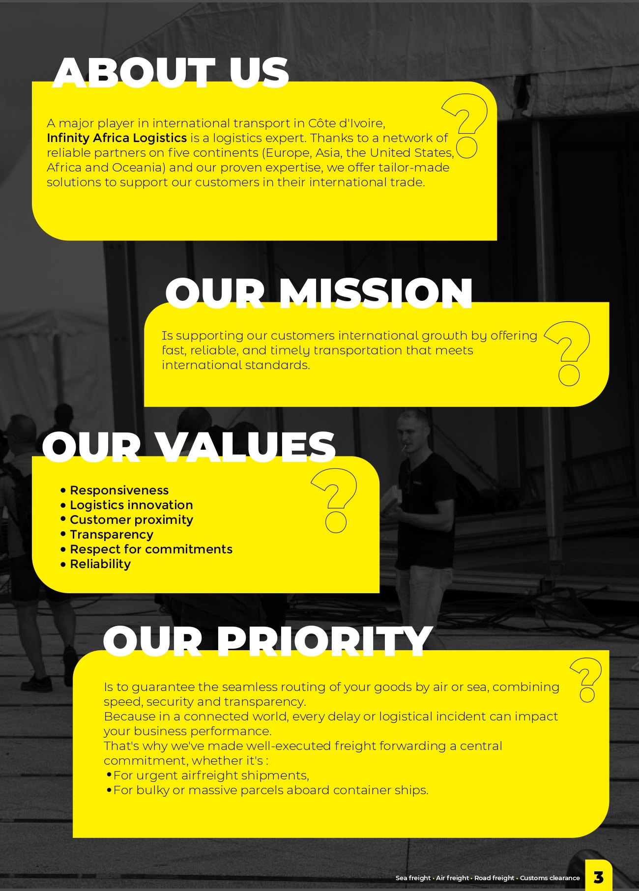 A major player in international transport in Ivory Coast, Infinity Africa Logistics is a logistics expert. Thanks to a network of reliable partners on five continents (Europe, Asia, the United States, Africa and Oceania) and our proven expertise, we offer tailor-made solutions to support our customers in their international trade. Our mission is supporting our customers international growth by offering fast, reliable, and timely