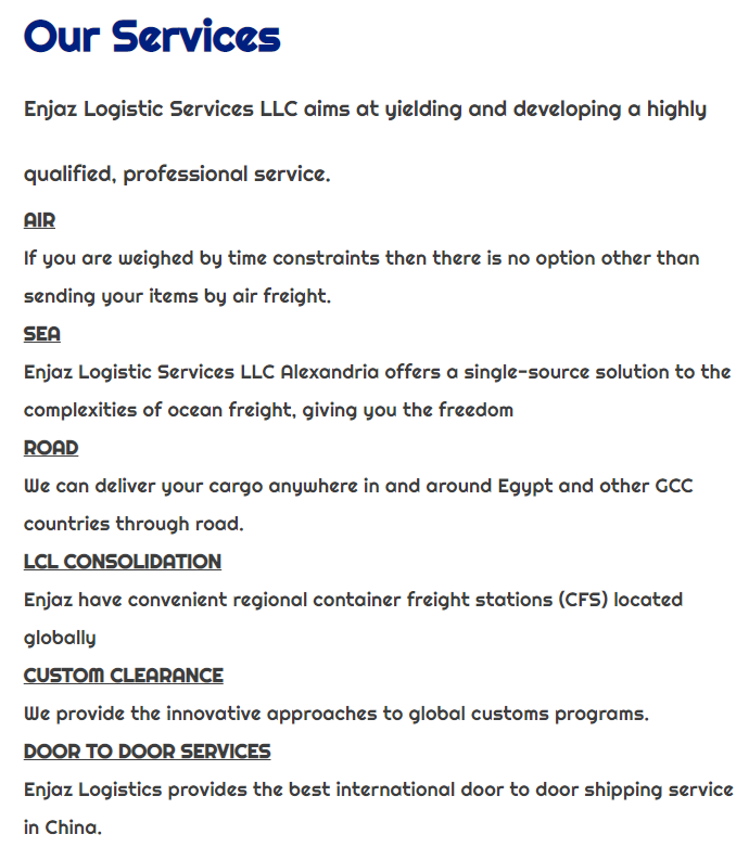 Company Profile: Enjaz Logistic Enjaz Logistic is a leading freight forwarding and NVOCC company with extensive experience in international sea and air freight. Our expertise spans across global logistics, ensuring seamless and efficient transportation of goods worldwide. Our Services: - International Sea Freight: We offer reliable and cost-effective sea freight services to destinations worldwide, leveraging our strong relationships with major shipping lines. - Air Freight: Our air freight services provide fast and secure transportation of goods, catering to urgent and time-sensitive shipments. - Customs Clearance: With a proven track record of successful customs clearance in all Egyptian ports and airports, we ensure compliance with regulations and expedite the clearance process. Our Strengths: - Experienced Team: Our team of logistics professionals possesses in-depth knowledge of international trade regulations, customs procedures, and transportation management. - Global Network: We have established strong partnerships with reputable logistics providers worldwide, enabling us to offer comprehensive and efficient services. - FIATA Membership: As a proud member of the International Federation of Freight Forwarders Associations (FIATA), we adhere to the highest standards of professionalism and integrity in the logistics industry. Our Mission: At Enjaz Logistic, our mission is to provide exceptional logistics services that exceed our clients' expectations. We strive to build long-term relationships with our partners, founded on trust, reliability, and a commitment to delivering outstanding value. Why Choose Enjaz Logistics? - Expertise in international logistics and customs clearance - Personalized service tailored to meet specific client needs - Strong global network and partnerships - Commitment to quality, reliability, and customer satisfaction Partner with Enjaz Logistics for all your logistics needs, and experience the difference that our expertise and dedication can make.