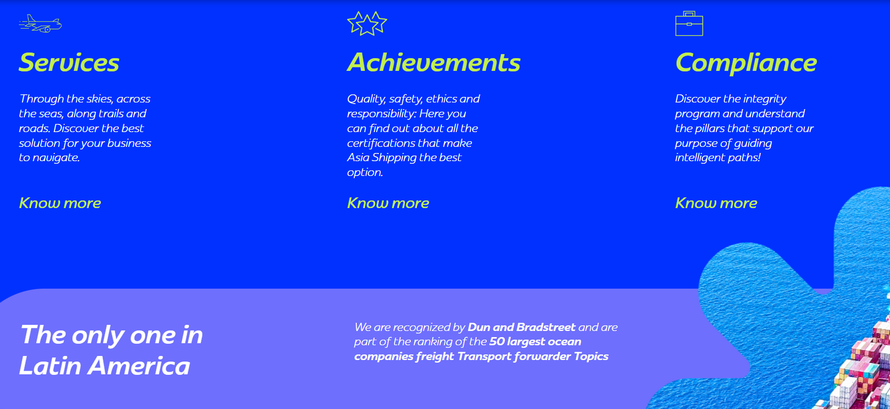 Asia Shipping International Transport Private Limited, whose name is eponymous of its Product Portfolio, began in New Delhi, India in the year 2012. The company proudly represents its Parent organization, AS Group. A Brazilian Multinational Logistics Service Provider in the Indian Sub-Continent, one of the world's largest logistics companies and the only integrated logistics specialist in Latin America.