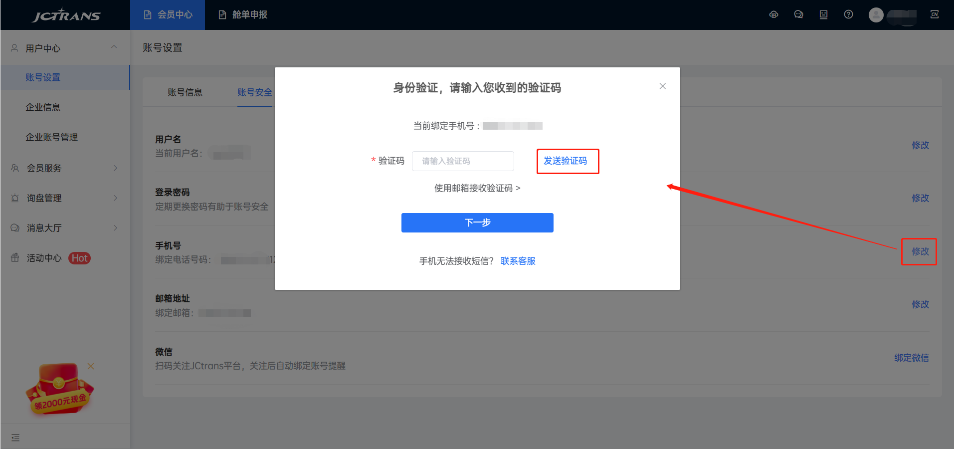 3、修改手机号以及邮箱均需要验证,若出现绑定的手机号/邮箱收不到验证的情况可点击“联系客服”,