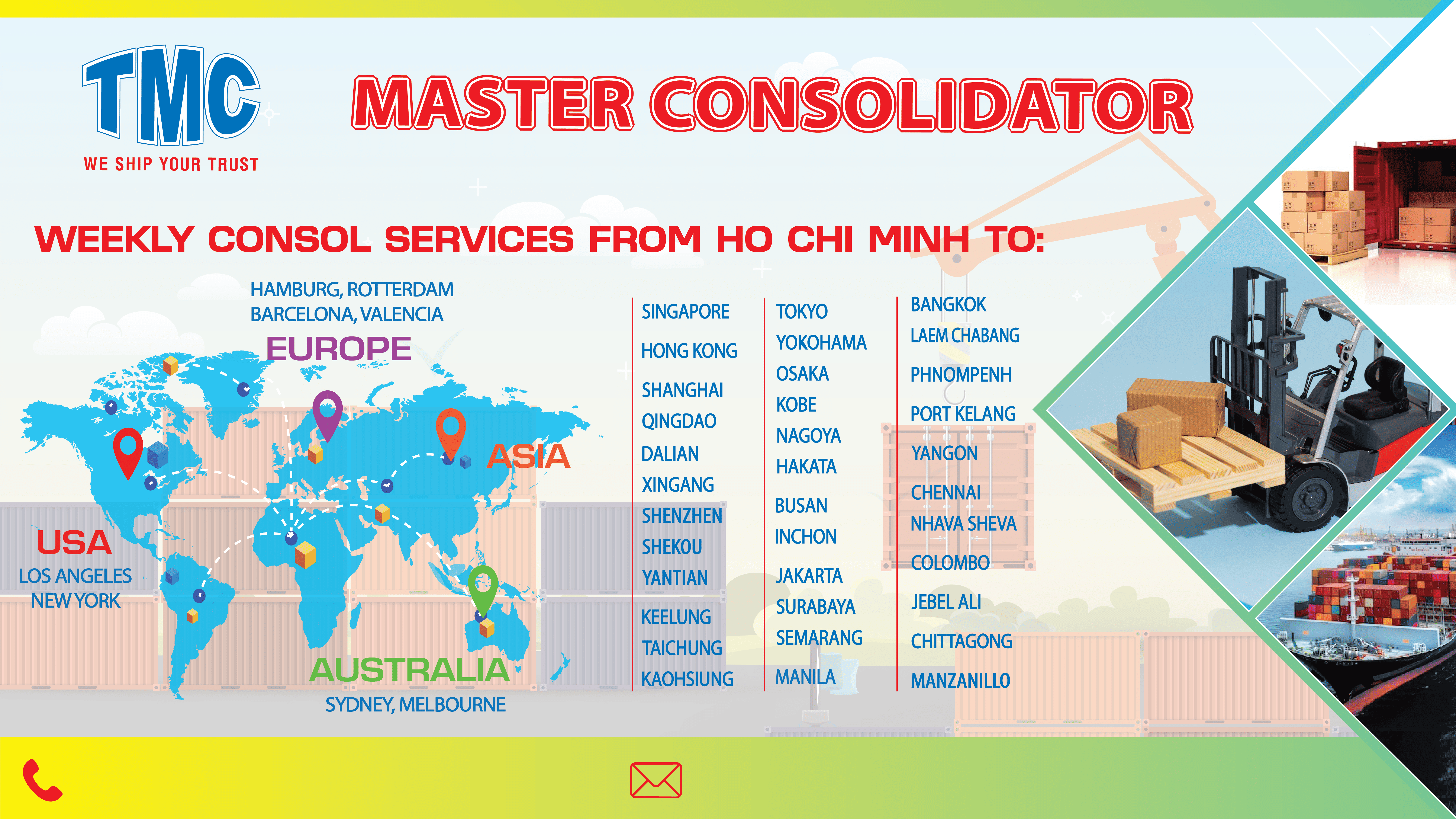 THAMI SHIPPING & AIRFREIGHT CORP. (TMC) is one of the leading logistics providers in Vietnam, widely recognized as a Top Master Consolidator (LCL) in the market. With over 27 years of experience, we provide weekly direct consolidation services connecting major ports of Vietnam with key gateways across Asia, Europe, Australia, and the USA.