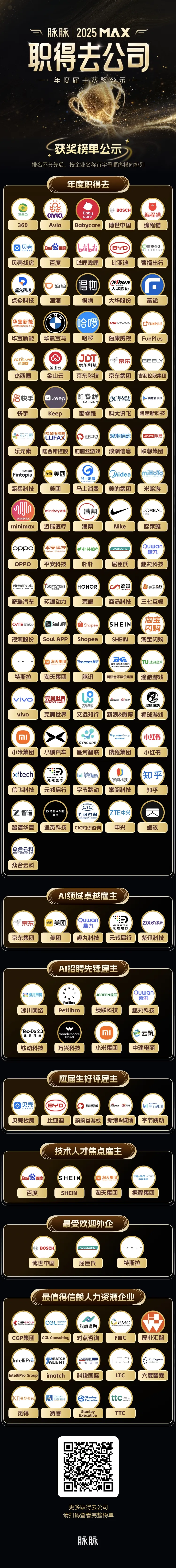 “脉脉MAX年度职得去雇主”评选,以平台真实的职场行为与声量数据为核心依据,结合企业影响力、行业口碑、人才流动趋势等多维度综合评出。它不只是一次评奖,更是中国职场人真实意愿的集中呈现——反映那些他们愿意推荐、愿意加入、并愿意与之共同成长的企业。