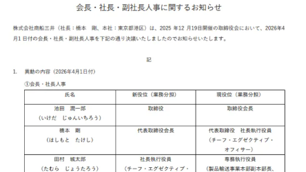 日本三大航运公司之一商船三井在2025年12月19日召开的董事会上,决议通过了2026年4月1日起生效的高层管理人员变动。商船三井宣布,Jotaro Tamura将于明年4月1日起接任总裁兼首席执行官一职,接替将转任董事长一职的Takeshi Hashimot