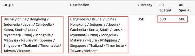 马士基官网通知,修订自2025年10月1日起生效的亚洲内部贸易特殊设备服务(SEP)附加费。