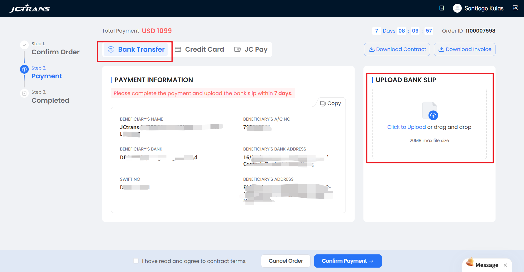 1.Bank Transfer: please upload the bank slip within7 days after T/T, you can download Inovice and contract on this page.