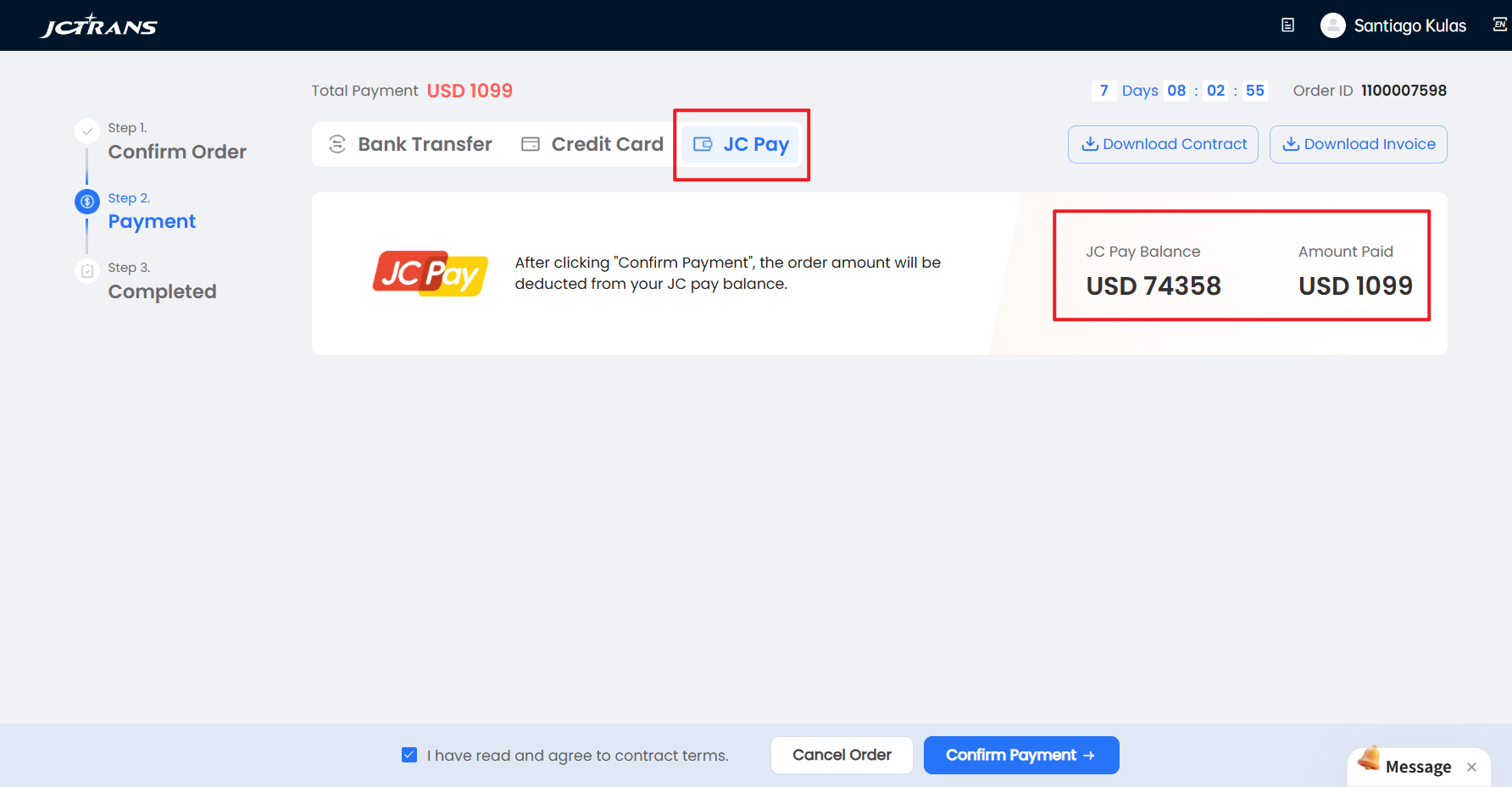 3.JC Pay: this payment method is only applicable when the JC Pay balance is greater than the order amount, otherwise this payment method will not be visible; after clicking confirm payment, the order amount will be directly deducted from your JC Pay balance.