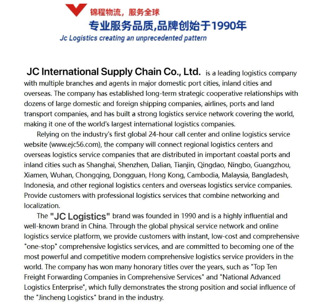 JC International Supply Chain Co., Ltd.is one of the world's largest integrated international logistics companies in China. We provide freight transportation and logistics, outsource solutions, and information services to continuously increased amount of customers through a network of more than 600 affiliate branches and overseas partners worldwide. To meet our customer's freight needs, we provide access to over 60,000 transport providers worldwide, including contract motor carriers, railroads, air freight carriers, and ocean carriers. With the service and dedication of approximately 5,000 employees, our performance-driven culture, and our proven track record of success, we have built a strong reputation as an industry leader.