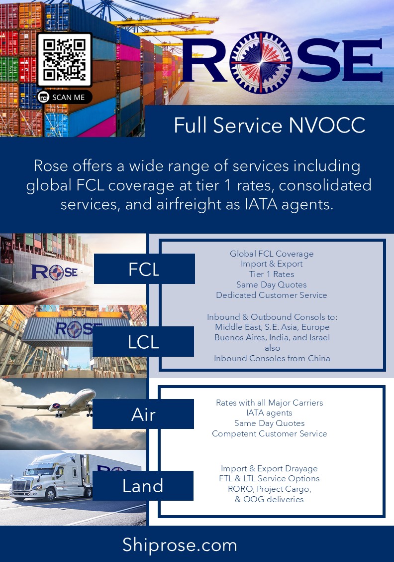 Established over 29 years ago, Rose Containerline is a full-service NVOCC and logistics provider. We offer ocean, air, and trucking services tailored to meet the specific needs of each client. Headquartered in New York, Rose maintains a national trucking and warehousing network with regional hubs in Atlanta, Chicago, and Los Angeles. Our attentive customer service and comprehensive logistics solutions simplify the process, making Rose and its clients more competitive. We are fully licensed by the FMC and accredited by TSA and IATA. Represented by professional forwarders on five continents, we can ship anytime, anywhere. The Rose Difference: • A management team that remains actively involved, regardless of our growth. • A commitment to understanding and responding to your business needs. • Long-term partnerships based on reciprocal business and joint sales growth. • Neutrality and protection of your clients. • Market intelligence, updates, and shared sales leads. • Service above all