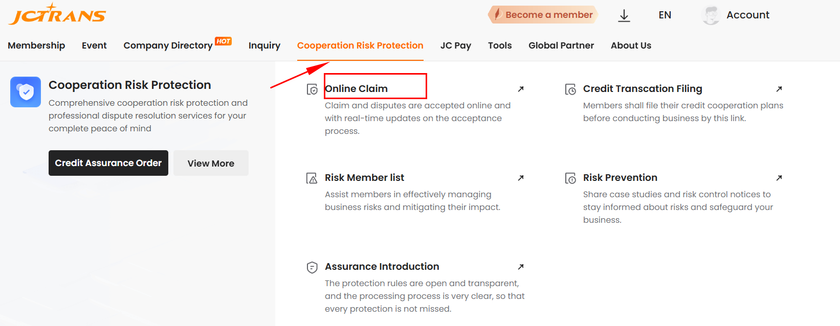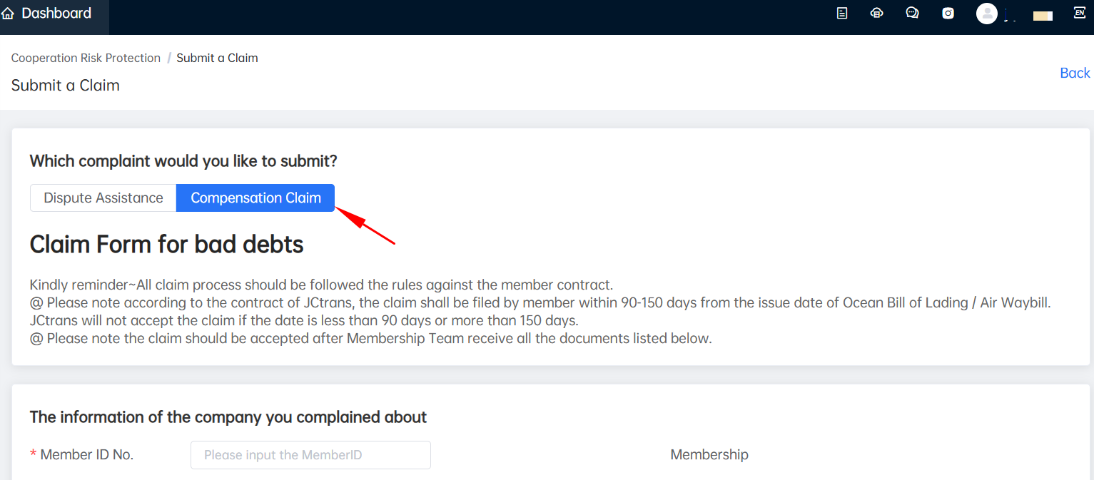Scope of Acceptance.The business cooperation between both parties must be JCtrans members and within the validity of bembership benefits service period; not suspended or blacklisted.The platform only accepts compensation claims for businesses within 90-150 days from the date of Bill of Lading signing.Compensation claims generally will be applied to cases where there are no objections or disputes between both parties. Cases requiring platform collection and compensation.