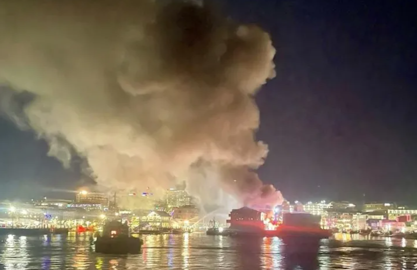 A Fire Broke Out in an Old Harbor Area of the United States, Engulfing Several Ships and Multiple Buildings.