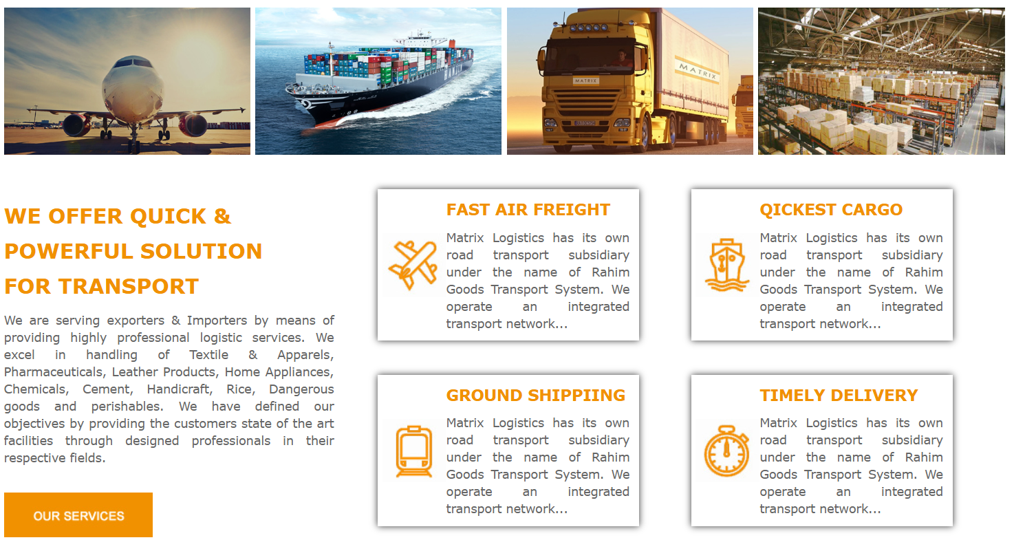 Matrix Logistics was founded in 1999, we are serving exporters & Importers by means of providing highly professional logistic services. We excel in handling of Textile & Apparels, Pharmaceuticals, Leather Products, Home Appliances, Chemicals, Cement, Handicraft, Rice, Dangerous goods and perishables. We have defined our objectives by providing the customers state of the art facilities through designed professionals in their respective fields. All this is necessary to keep the group’s activities alive and forging in a market which is not only cost conscious but also remains vigilant on matters of service.